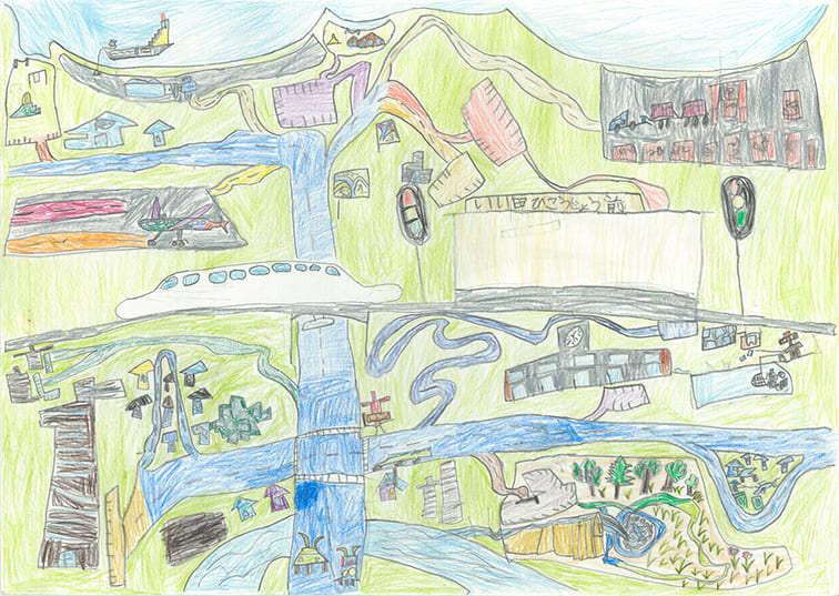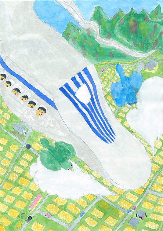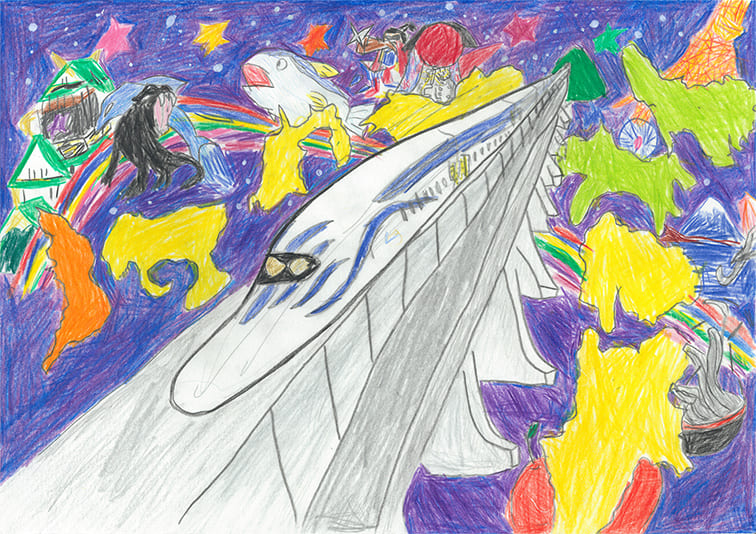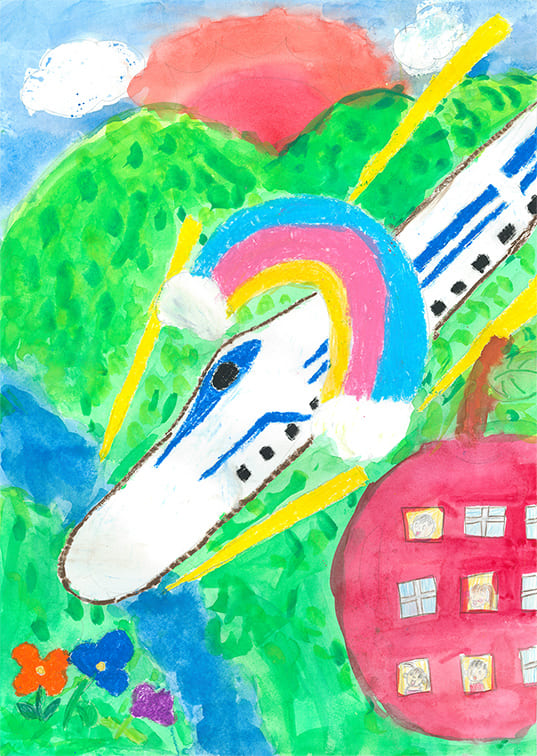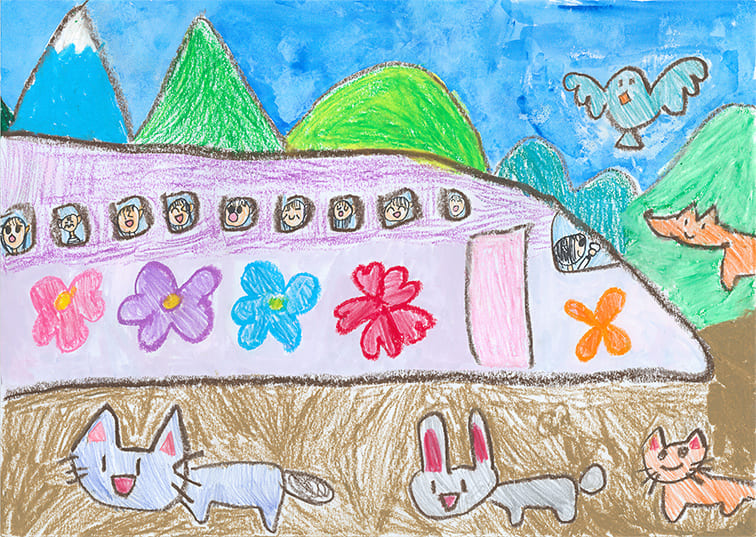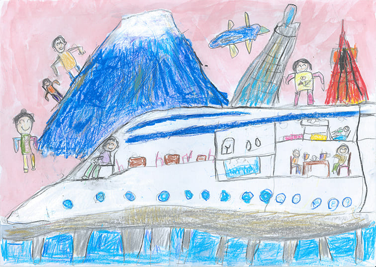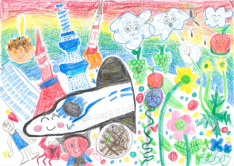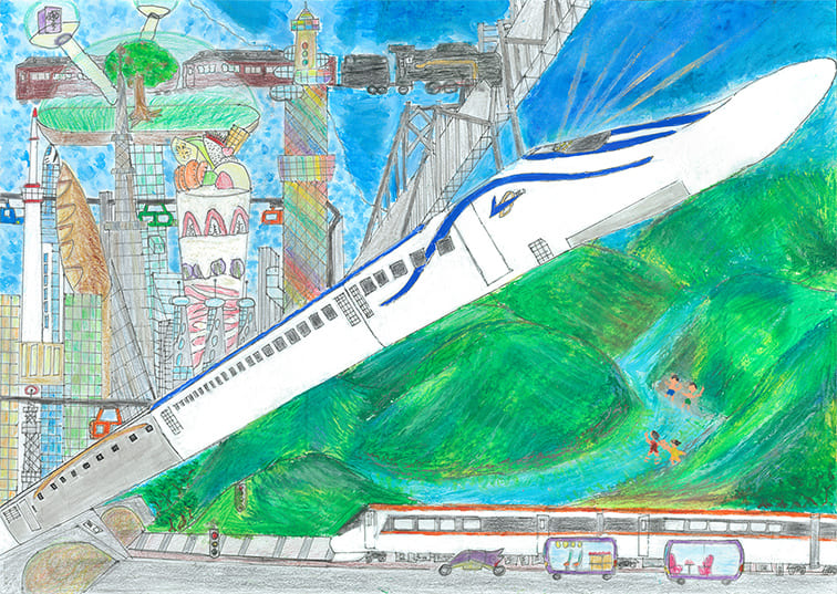 ●八つ切りサイズ(27cm×38cm・タテヨコ自由)の画用紙に、「あたらしい乗り物とわたしのまち」をテーマに絵を描いてください。