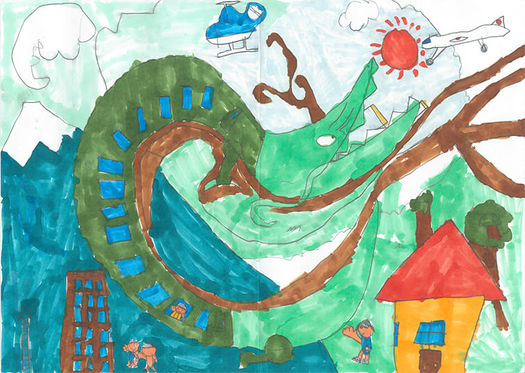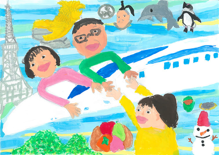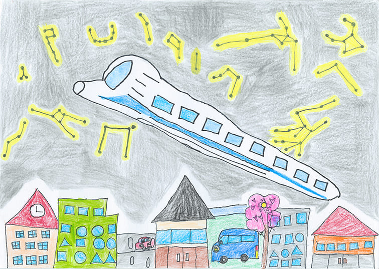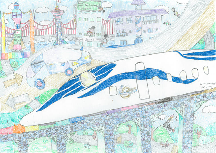 ●八つ切りサイズ(27cm×38cm・タテヨコ自由)の画用紙に、「あたらしい乗り物とわたしのまち」をテーマに絵を描いてください。